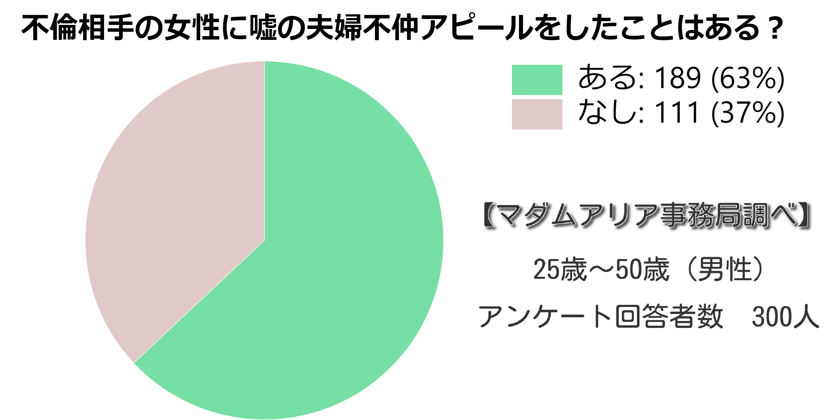本当のことではなく、「うまくいってないんだ」「奥さんとは仲が悪い」と嘘の夫婦不仲アピールをした既婚者男性は63%です。
